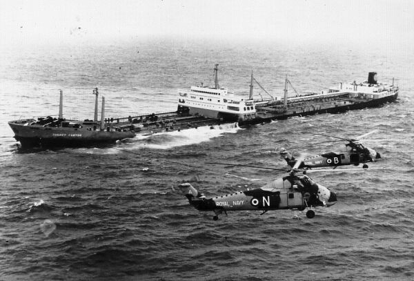 The 970 foot long suexmax tanker Torrey Canyon, bound for Milford Haven, ran aground on Pollard Rock, Seven Stones reef between Land’s End and the Isles of Scilly on March 18, 1967. The tanker with its cargo of 119,328 tons of crude oil from Kuwait became the largest shipwreck and oil spill to that date.