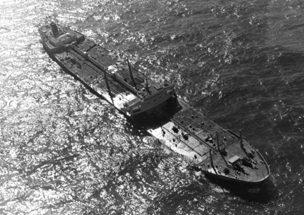 By March 26, the Torrey Canyon had broken-up on the reef by the heavy seas. When the tanker broke her back, an estimated 45,000 tons of oil was released into the sea. The resulting oil slick would be blown southeasterly until it washed onto the west coast of Brittany.